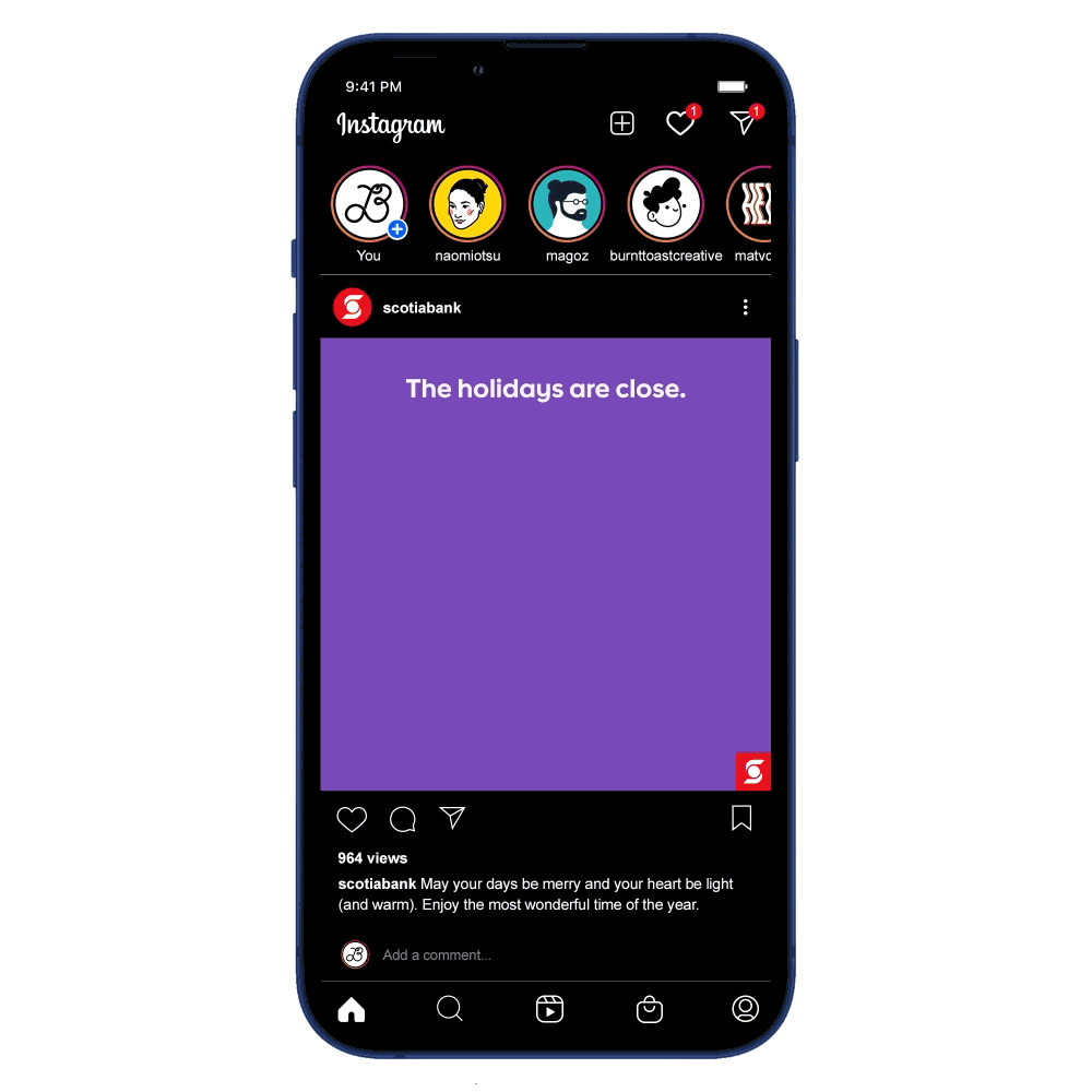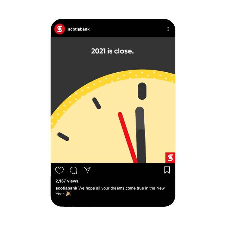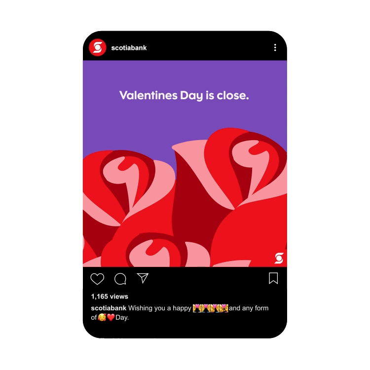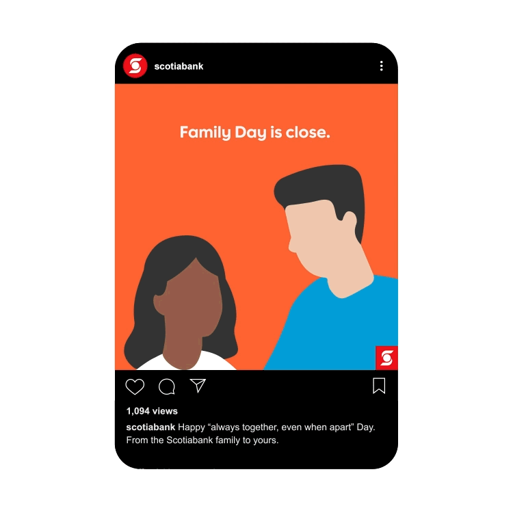 To humanize the Scotiabank brand instead of being overly promotional, the intention was to appeal to human connections by celebrating familiar holidays. During ideation, I decided the best way to build human connection was by leveraging quirky humour, especially in the animated sense. The day-of posts surprised and delighted customers providing closure to the teasers that were posted in advance so that they could enjoy their holiday. I managed the art direction, animations, and vector illustrations.